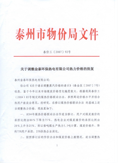 关于调整金泰环保热电有限公司热力价格的批复