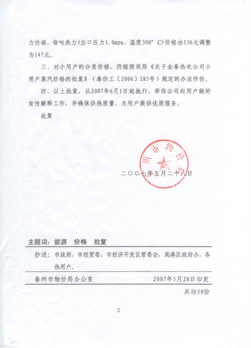 关于调整金泰环保热电有限公司热力价格的批复