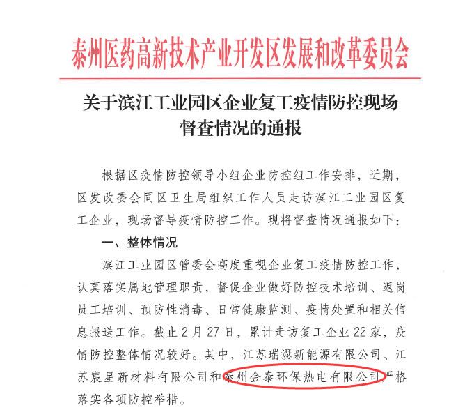 疫情期间,医药高新区、滨江工业园区纪委、工信局、市场监管局等部门到企业走访调研疫情防控工作,我公司的防疫工作得到了疫情防控领导小组的高度认可,严谨的态度、细致的检查为金泰热电构筑起了一道坚实的防控堡垒。